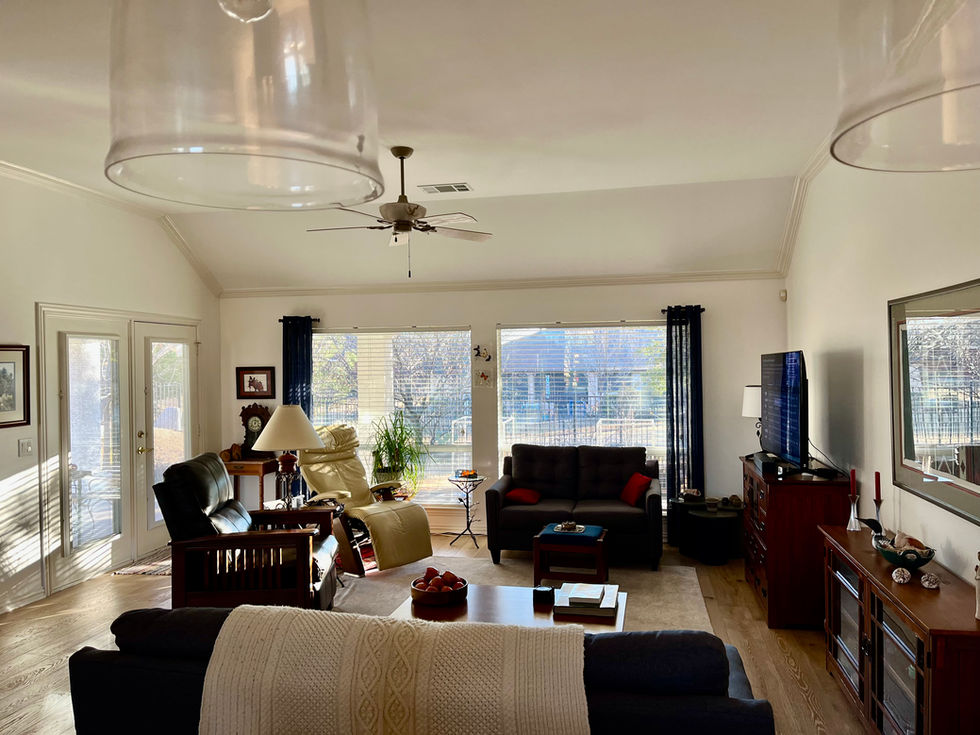 Small changes make big impacts. The before, hand-rendering vision, and final products demonstrate that adding new seating, curtains, and accessories make this space more comfortable.